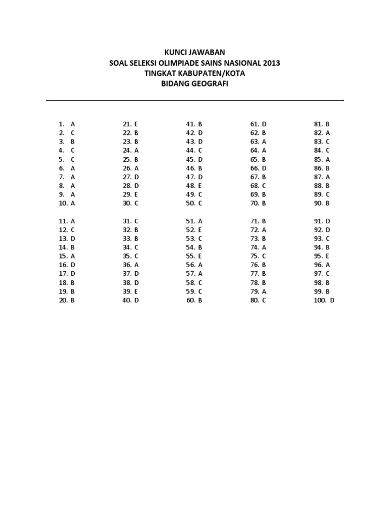 Bisa di gunakan untuk belajar dan persiapan untuk mengikuti olimpiade geografi ataupun osn geografi tingkat kabupaten semoga bermanfaat ! Soal osn 2014 tingkat sma. Maka dari itu kalian wajib mempersiapkan diri dengan bekal ilmu dan latihan soal sebanyak mungkin. Mar 22, 2017 · kesempatan kali ini saya akan berbagi soal osk geografi 2017 beserta kunci jawabannya. Kalau osn kebumian hanya aspek fisik bumi saja kan, tapi kalau geografi adalah keduanya.